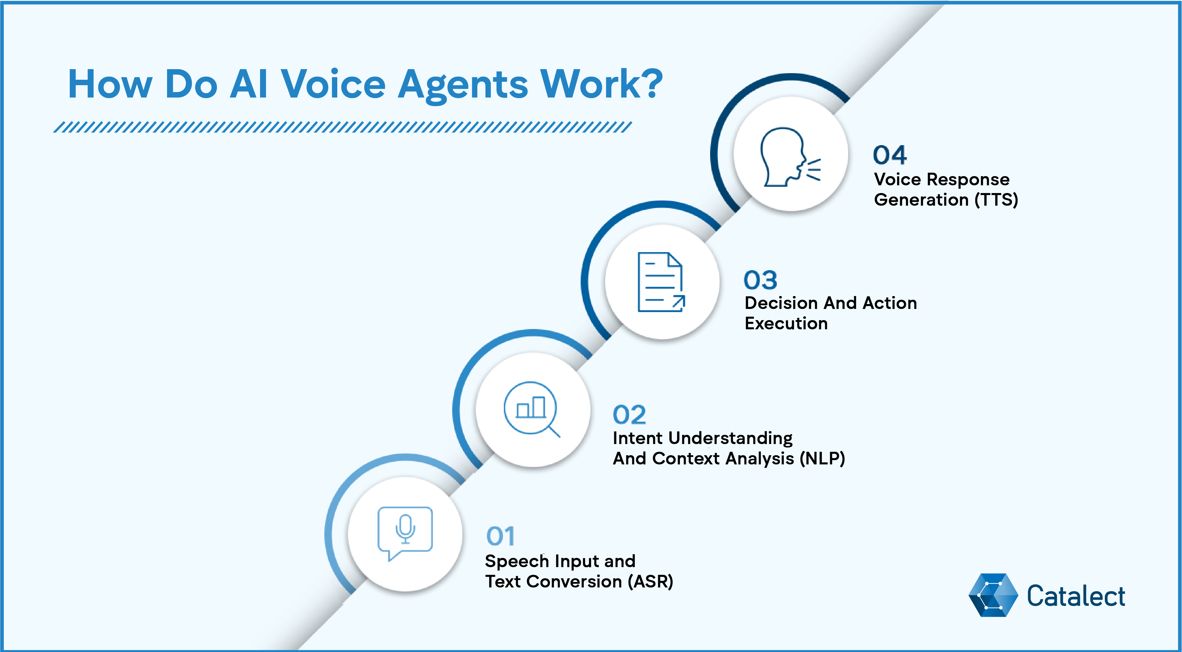 AI Voice Agents operate at the intersection of voice technology, data analytics, and decision intelligence, transforming spoken language into actionable business outcomes. What makes them powerful isn’t just their ability to recognize words, but it’s their capacity to understand meaning, respond naturally, and execute tasks seamlessly in real time.